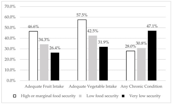 Results of the bivariate analyses (Figure 2) showed that lower levels of household food security (higher food insecurity) were associated with lower levels of F+V intake and higher levels of any chronic condition. Among participants reporting very low food security, only 26.4% and 31.9% had an adequate F+V intake, respectively, and 47.1% had a chronic condition.