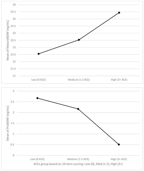 Levels of pro− and mature BDNF across ACEs levels.