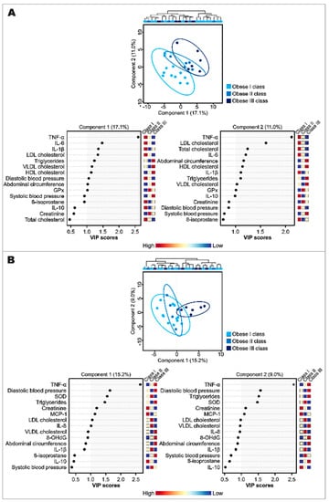 Discriminant analysis by partial least squares (PLS-DA) and VIP score plot (for the top 15 most important variables) of anthropometric and biochemical parameters, and inflammatory and oxidative stress biomarkers after the intake of Pera (A) and Moro (B) orange juices in patients with class I, II, or II of obesity (sample sizes in MOJ intervention: obesity class I, n = 12; obesity class II, n = 5; obesity class III, n = 6). 8-OHdG: 8-hydroxy-2′-deoxyguanosine; BMI: body mass index; GPx: glutathione peroxidase; HDL: high-density lipoprotein; IL: interleukin; LDL: low-density lipoprotein; MCP-1: monocyte chemoattractant protein-1; ORAC: oxygen radical absorbance capacity; SOD: superoxide dismutase; TNF-α: tumor necrosis factor alpha; VLDL: very-low-density lipoprotein.