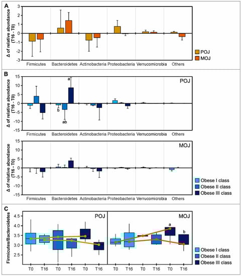 Effect of Pera (POJ) and Moro orange juice (MOJ) intake on the gut microbiota OTUs (phylum) and on the Firmicutes/Bacteroidetes (F/B) ratio. Delta of the relative abundance of the most abundant bacterial phyla when patients are grouped by (A) intervention and (B) obesity class. (C) Boxplot showing F/B ratio of the individuals in obesity classes I, II, or III before (T0) and after (T16) POJ and MOJ intake. For clarity, phyla with an overall abundance of less than 0.5% were summed into “others”. Different superscript letters indicate statistical significance (p < 0.05) between obesity classes (Kruskal–Wallis test) or between T0 and T16 (Wilcoxon test) (sample sizes in POJ intervention: obesity class I, n = 9; obesity class II, n = 3; obesity class III, n = 3; sample sizes in MOJ intervention: obesity class I, n = 8; obesity class II, n = 5; obesity class III, n = 5).