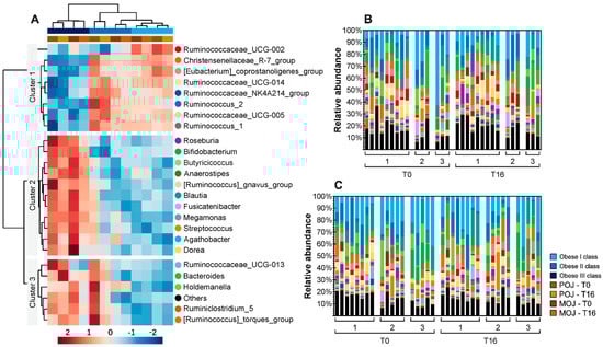 Differential abundance of the top 25 most significant bacterial genera in fecal samples of patients before (T0) and after (T16) the intake of Pera (POJ) and Moro orange juice (MOJ). (A) Heatmap showing the gut microbiota genera that were differentially abundant among obesity classes. Rows (genera) and columns (samples) were ordered by hierarchical clustering. (B,C) Stacked bar plot showing the relative abundance of microbial genera uncovered in each sample, sorted by obesity class, before (T0) and after (T16) POJ (B) or MOJ (C) intake. For clarity, genera with an overall abundance of less than 0.5% were summed into “others” (sample sizes in POJ intervention: obesity class I, n = 9; obesity class II, n = 3; obesity class III, n = 3; sample sizes in MOJ intervention: obesity class I, n = 8; obesity class II, n = 5; obesity class III, n = 5).