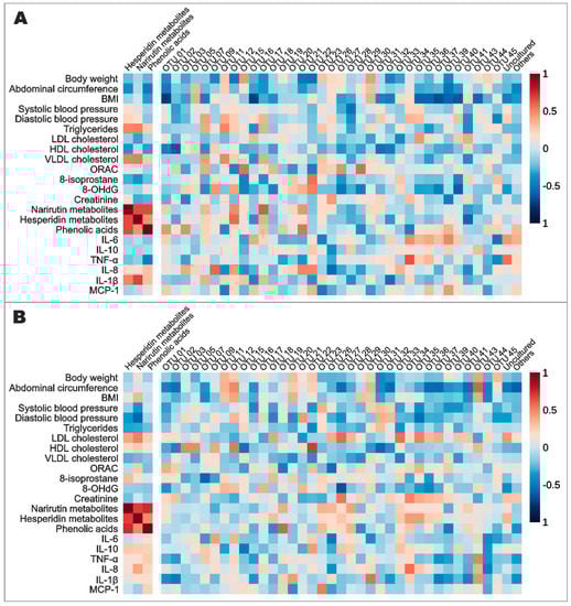 Spearman’s correlation among excreted flavanone metabolites, most abundant genera in the gut microbiota, anthropometric variables, biochemical parameters, and inflammatory and oxidative stress biomarkers analyzed before and after the intake of Pera (A) and Moro (B) orange juices. 8-OHdG: 8-hydroxy-2′-deoxyguanosine; BMI: body mass index; HDL: high-density lipoprotein; IL: interleukin; LDL: low-density lipoprotein; MCP-1: monocyte chemoattractant protein-1; ORAC: oxygen radical absorbance capacity; OTU: operational taxonomic unit; TNF-α: tumor necrosis factor alpha; VLDL: very-low-density lipoprotein. OTU IDs are from Table S11.