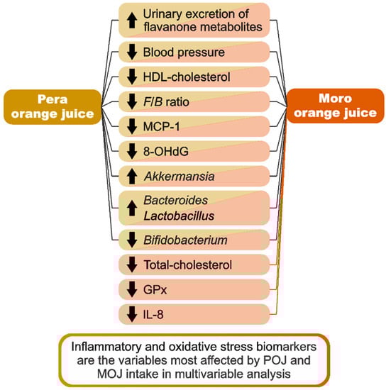 As shown by the PLS-DA model, oxidative stress and inflammatory biomarkers were most prominently affected by orange juice intake. TNF-α, IL-6, IL-8, MCP-1, SOD, GPx, and lipid parameter changes seemed to explain a greater part of the effects of POJ/MOJ intake despite interindividual variation. We also observed that BMI was not the most important variable for differentiating the patient response to orange juice intake, a result that complements the findings of a previous study by our research group [30]. Nishioka et al. [30] evaluated the phase II metabolite excretion profile of flavanones after POJ and MOJ intake and observed that BMI and gender were not the most important variables for stratifying the volunteers, indicating that other factors have a greater impact on flavanone urinary excretion than BMI. Recent studies identified novel polymorphisms (SULT1A1, SULT1C4, and ABCC2) [60] and microRNAs (miR-375, miR-150-5p, miR-25-3p, and miR-451a) [61,62,63] associated with the interindividual variability in flavanones absorption and with the heterogeneity of the biological response to orange juice consumption, respectively. However, single nucleotide polymorphisms and microRNAs are only two of the several factors involved in those processes.