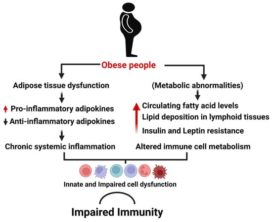 It is unclear what specific mechanism(s) makes obese subjects more vulnerable to infectious diseases as compared to people with BMI < 25. []. However, obesity-related changes to the host immune system are thought to play a significant role [,,]. Obesity alters both innate and adaptive immune responses and as a result, the immunological response to infectious pathogens is weakened, resulting in worse outcomes post-infection. Obesity induced systemic inflammation and impaired immune function are illustrated in Figure 1.
