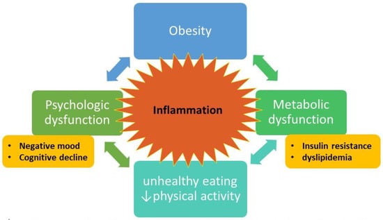 Obesity is also linked to mood dysregulation as a risk factor. Chronic inflammation arising from higher fat mass and metabolic dysfunction appears to be associated with psychological effects such as depression and anxiety []. In a study of data from a mental health questionnaire of participants in the U.K. Biobank (n = 145,668), Casanova et al. demonstrated that higher adiposity leads to higher odds of depression, severity of depression, and lower wellbeing, regardless of genetic predisposition to metabolic dysfunction (e.g., adiposity genetic variants with favorable or unfavorable metabolic profiles based on HDL cholesterol, triglycerides, and T2DM risk) []; limitations of the analysis include lack of diversity in the European study population and potential bias in the subset of participants involved in the mental health questionnaire substudy. Interestingly, the metabolically favorable adiposity variants were associated with higher levels of the proinflammatory cytokine CRP [].
