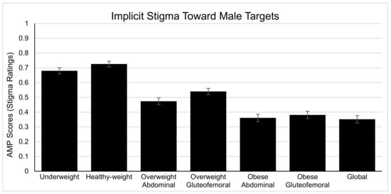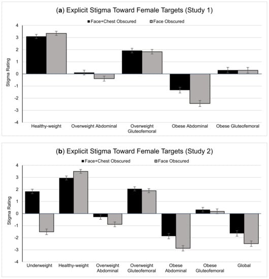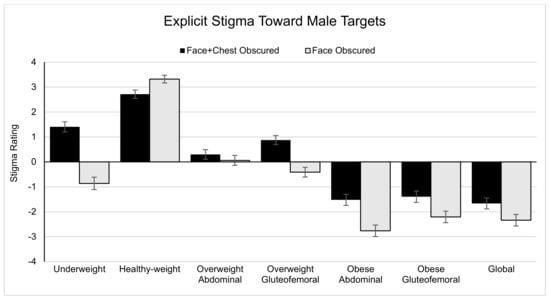 Explicit Stigma. Yes. A 2 (Target gender: female, male) × 2 (Target view: faces and chests obscured, only faces obscured) × 7 (Target shape) ANOVA on data from Study 2 (wherein male targets were included) revealed a significant three-way interaction (see Table 5 for omnibus effects for these analyses). When the targets had faces and chests obscured, male targets were more stigmatized than female targets that were overweight with gluteofemoral fat (p < 0.001, d = 0.43) or obese with gluteofemoral fat (p < 0.001, d = 0.62), possibly underscoring the role of such fat in social perceptions of female (but not male) attractiveness [20,21]. Conversely, female targets were more stigmatized than male targets when they were overweight with abdominal fat (p < 0.001, d = 0.31) or obese with abdominal fat (p = 0.039, d = 0.13), perhaps indicating greater fat stigma toward women in general and/or some buffering toward men with this fat deposition [8,22]. Ratings of globally obese targets did not differ by target gender (p = 0.921, d = 0.01).