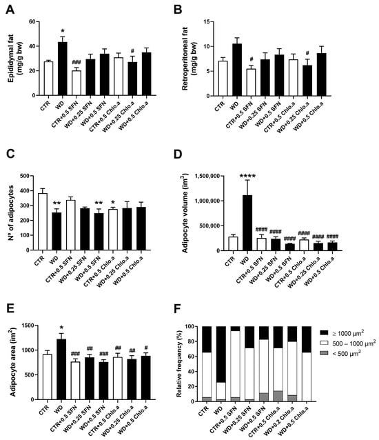 White adipose tissue weight and morphometric analysis of adipocytes. Mice were fed a Western control diet (CTR) or a Western diet + 0.2% cholesterol (WD) for 14 weeks. Experimental groups were supplemented with sulforaphane (SFN; 0.25 or 0.5 mg/kg/day) or chlorophyll a (Chlo.a; 0.2 or 0.5 mg/kg/day) only in the last 4 weeks of the study. Relative weight of (A) epididymal fat and (B) retroperitoneal fat (C) number of adipocytes; (D) volume per adipocyte; (E) area per adipocyte; and (F) relative frequency of adipocyte size (calculated based on adipocyte area). Data are expressed as mean ± SEM (n = 7). * p < 0.05, ** p < 0.01, **** p < 0.0001, different from CTR; # p < 0.05, ## p < 0.01, ### p < 0.001, #### p < 0.001, different from WD. One-way ANOVA followed by Dunnett’s multiple comparison test.