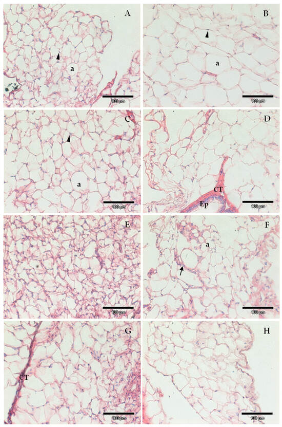Exemplificative images of epididymal surrounding adipose tissue of animals from the different experimental groups; (A) Western control diet (CTR); (B) Western diet + 0.2% cholesterol (WD); (C) CTR supplemented with sulforaphane (SFN, 0.5 mg/kg/day); (D) WD supplemented with sulforaphane (SFN, 0.25 mg/kg/day); (E) WD supplemented with sulforaphane (SFN, 0.5 mg/kg/day); (F) CTR supplemented with chlorophyll a (Chlo.a; 0.5 mg/kg/day); (G) WD supplemented with chlorophyll a (Chlo.a; 0.2 mg/kg/day); (H) WD supplemented with chlorophyll a (Chlo.a; 0.5 mg/kg/day). a, adipocyte, CT, connective tissue; Ep, epididymal epithelium; arrowhead, nuclei; arrow, blood vessel. Barr = 100 µm.