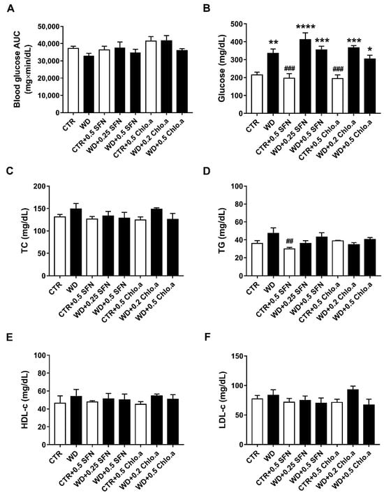 The intraperitoneal glucose tolerance test (IPGTT) was performed as there is a correlation between obesity and glucose tolerance. The IPGTT was conducted in the last week of the study. The blood glucose AUC analysis (Figure 4A) revealed no differences between the various experimental groups, indicating that there was no development of glucose intolerance in this animal model. Nevertheless, at the end of the study, regardless of SFN or Chlo.a supplementation, all groups fed a Western diet showed the highest glycaemic levels (Figure 4B), which were statistically different (p < 0.05) from CTR, showing no influence of SFN or Chlo.a treatment in plasmatic glucose levels. However, concerning the plasma levels of TG, TC, HDL-c and estimated levels of LDL-c (Figure 4C–F), in general, no significant differences were found between the experimental groups in our study, showing no alterations induced by the diet or treatment.