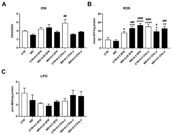 Hepatic oxidative stress parameters. Mice were fed a Western control diet (CTR) or a Western diet + 0.2% cholesterol (WD) for 14 weeks. Experimental groups were supplemented with sulforaphane (SFN; 0.25 or 0.5 mg/kg/day) or chlorophyll a (Chlo.a; 0.2 or 0.5 mg/kg/day) only during the last 4 weeks of the study. The levels of (A) the oxidative stress index (OSI), (B) reactive oxygen species (ROS) and (C) malondialdehyde (MDA), an indicator of lipid peroxidation (LPO), were evaluated in the liver. Data are expressed as mean ± SEM (n = 7). * p < 0.05, ** p < 0.01, *** p < 0.001, **** p < 0.0001, different from CTR; # p < 0.05, ## p < 0.01, ### p < 0.001, #### p < 0.0001, different from WD. DCF, dichlorofluorescein diacetate; GSH, reduce glutathione; GSSG, oxidized glutathione.