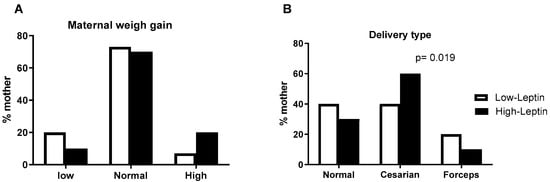 The influence of leptin on body weight is well known. Here, we found a positive association between maternal leptinemia with pre-gestational BMI and maternal weight at the end of pregnancy. These findings are consistent with those previously published, analyzing a population similar to that recruited in the present study [,]. The authors found a consistent association between maternal blood leptin and pre-gestational and final BMI in women with uncomplicated pregnancy []. Other studies also confirmed that weight and adiposity gain are important factors for increasing circulating leptin levels in women presenting gestational diabetes and pre-eclampsia [,,].