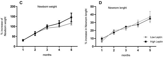 (A) Maternal Weight gain, (B) Delivery type, (C) Newborn weight, and (D) length in the first months of life. n = 15 and 10 for the Low and High-leptin groups, respectively. Results are expressed as mean (bars = standard error (vertical lines). ((A,B) Chi-square and (C,D) Student t-tests).
