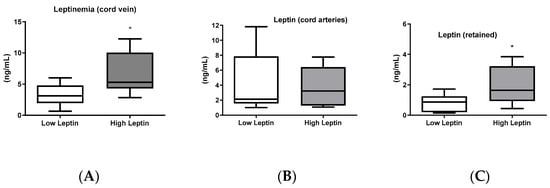 Leptinemia in umbilical cord blood: (A): Leptinemia in the umbilical vein (n = 15 for low leptinemia and n = 10 for high leptinemia), p = 0.016. (B): Leptinemia in the umbilical artery (n = 14 for low leptinemia and n = 6 for high leptinemia), p = 0.77. (C): Leptin retained by the fetus (venous leptinemia—arterial leptinemia) (n = 10 for low leptinemia and n = 5 for high leptinemia), p = 0.026. Box and whiskers (median min to max). t-test or Mann–Whitney test. * Statistically different (p < 0.05).