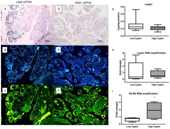 Placental leptin. Immunofluorescence for leptin in the placenta: (A,C): low leptinemia group and (D,F) high leptinemia group. (A,D): light microscope imaging; (B,E): cell nucleus stained with DAPI.: (C,F): Leptin stained with Ob A-20 antibody, Santa Cruz, and Alexa fluor 546. (G): Leptin concentration in the placenta, measured by ELISA, in ng of leptin per mg of proteins (n = 12 for low leptinemia and n = 8 for high leptinemia), p = 0.25. (H): Leptin RNA expression in the placenta, measured by real-time PCR, in relative amplification (n = 12 for low leptinemia and n = 6 for high leptinemia), p = 0.27. (I): Leptin receptor mRNA (Ob-Rb) expression in the placenta, measured by real-time PCR, in relative amplification (n = 6 for low leptinemia and n = 4 for high leptinemia), * p = 0.05. Results are expressed as Box and whiskers (median min to max): t-test or Mann–Whitney test.