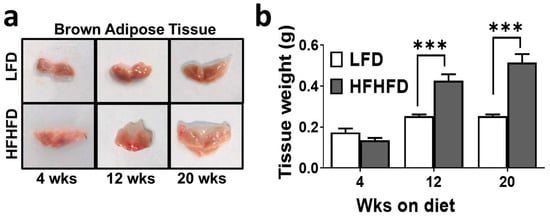 - Roberts-Toler, C.; O’Neill, B.T.; Cypess, A.M. Diet-induced obesity causes insulin resistance in mouse brown adipose tissue. Obesity 2015, 23, 1765–1770. [Google Scholar] [CrossRef]