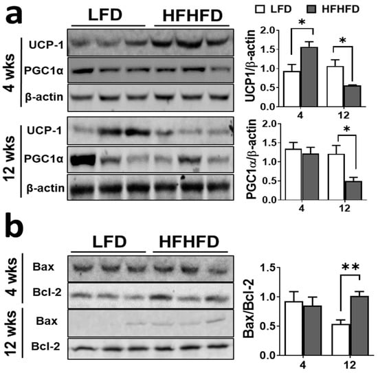 - Ohtomo, T.; Ino, K.; Miyashita, R.; Chigira, M.; Nakamura, M.; Someya, K.; Inaba, N.; Fujita, M.; Takagi, M.; Yamada, J. Chronic high-fat feeding impairs adaptive induction of mitochondrial fatty acid combustion-associated proteins in brown adipose tissue of mice. Biochem. Biophys. Rep. 2017, 10, 32–38. [Google Scholar] [CrossRef] [PubMed]