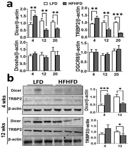 3.4. HFHFD Feeding Inhibits miRNA Biogenesis Machinery