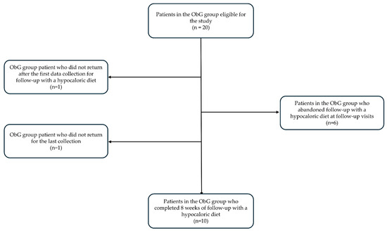 A total of 20 women were eligible for the present study. The Obese Group (ObG) composed of 10 women who completed the 8-week intervention. The ObG was composed of women with grade III obesity, with a mean age of 33.7 ± 3.1 years (Figure 1).