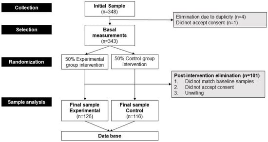 The general design of the intervention included the participation of 80 students majoring in medicine, nursing, dietetics, and psychology (n = 320). However, although the baseline measurement did achieve the expected goal, the experimental dropout rate after the intervention was 30.4%. Figure 1 provides a general summary of the methodology and criteria determining the final sample size for the study.