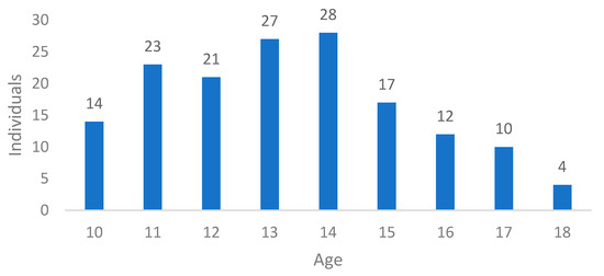 The individuals who participated in this study range in age from 10 to 18 years old, with the age group of 13 to 14 years being the most frequent in this sample (Figure 1).
