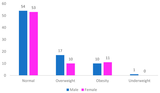 In terms of body mass index (BMI), it was found that 27 students (17.3%) were overweight, predominantly males. Ten boys and eleven girls were classified as obese (13.5%), while one student (0.6%) had a BMI below the expected range. The remaining students (68.6%) had a BMI within the normal range (Figure 3).