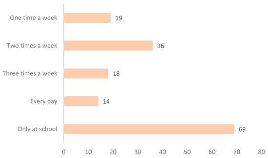 Regarding the frequency of physical exercise among individuals, 69 students (44.2%) reported only exercising during physical education classes at school, while the remaining 55.8% of individuals engage in physical exercise both at school and outside school. Among those who exercise beyond physical education classes, 19 students (12.2%) exercise once a week, 36 students (23.1%) exercise twice a week, 18 students (11.5%) exercise three times a week, and 14 students (9%) exercise daily (Figure 4).