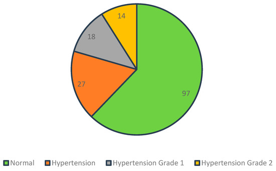 Based on the assessment of blood pressure values and analysis using appropriate percentiles for sex, age, and height, it was found that 37.8% (n = 59) of students had blood pressure values above normal, while 62.2% (n = 97) had a normal blood pressure. Among those with elevated blood pressure values, 17.3% (n = 27) had hypertension (HTN), 11.5% (n = 18) had HTN stage 1, and 9% (n = 14) had HTN stage 2 (Figure 5).