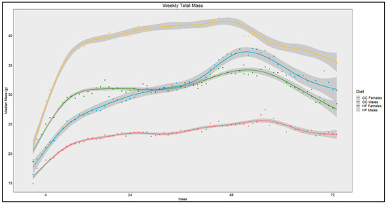 The average weekly mass from each diet and sex was locally estimated using scatterplot smoothing (LOESS) (Figure 1). The points indicate the actual weekly mean total mass from the diet group with the sample size dependent on censorship, ranging from 32 at T0 to 7 at week 72. The gray bands indicate SE calculated in R for the LOESS. Figure 1 shows a progressive increase in total mass until ~20 weeks for all diets, at which point CC mouse weights begin to plateau while HF mouse weights continued to increase. Notably, the HF female mass increased more rapidly than other groups until ~48 weeks. In contrast, males, regardless of diet, maintained the largest mass until ~week 28, at which time the HF females attained a mass greater than the CC males. This phenomenon was observed for the remainder of this study. It is of note that the CC females had markedly lower total body mass than the other groups for the duration of this study.