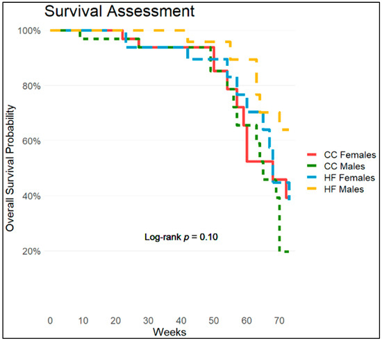 Kaplan–Meier survival assessment over study duration for male and female mice maintained on control and HFD. Colors red, green, blue, and yellow represent CC females, CC males, HF females, and HF males, respectively (n ≤ 32). The log-rank test for significance was calculated. Results showed Chi-square = 6.3 on 3 degrees of freedom and p-value = 0.1, α = 0.1.
