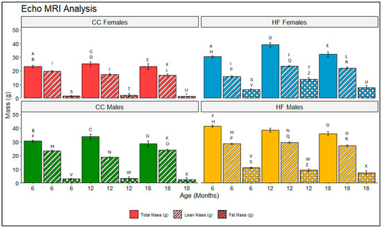 Two-way ANOVA showing differences between each diet and sex at specific time points. Significance is indicated by matching letters (A is significantly different from A) and only with p-values ≤ 0.05. Pairwise comparisons were only made within sexes or within diets. The colors red, green, blue, and yellow represent CC females, CC males, HF females, and HF males, respectively. Solid bars indicate total mass, striped bars indicate lean mass, and dotted bars indicate fat mass.