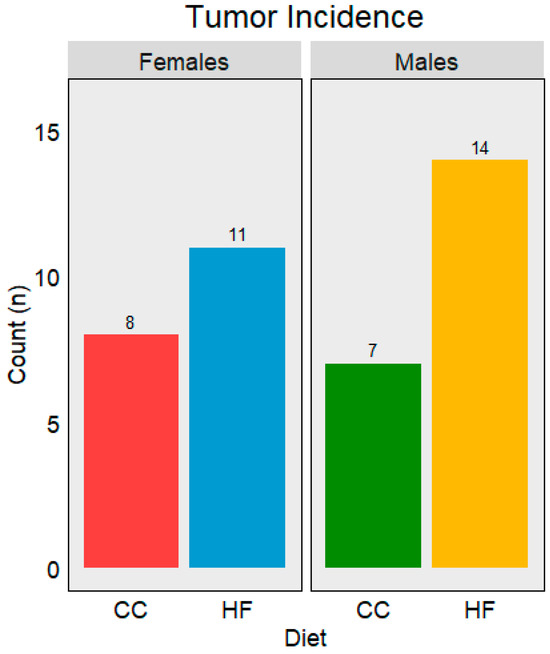 Tumor development as a function of diet and sex is summarized in Figure 4. Interestingly, there was a strong sex-based difference in the tumor type which developed as a function of diet. The most abundant tumor types for each group were the following: ovarian tumors for the CC females (4) and HF females (5), lung tumors for the CC males (4), and liver tumors for the HF males (13). Tumor tissue incidence is summarized in Table 5. Male C3H mice developed either lung tumors or liver tumors. In contrast, the females demonstrated the development of ovarian tumors in addition to lung and liver tumors across both diets. Most tumors were observed during the 18-month collection of tissues, whereas none were identified prior to 12 months (Table 5).