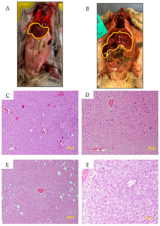 Sample images of normal and cancerous livers from different diets. Skin and muscles layers reflected to expose (A) normal liver and (B) cancerous liver. Livers outlined in yellow. (C–F) are histological sections of livers stained with H&E from male C3H mice at 18 months. (C) Normal liver from CC mice, (D) liver tumor from CC mice, (E) normal Liver from HF mice, and (F) liver tumor from HF mice.