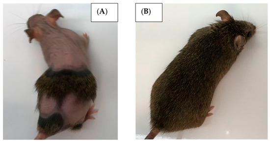 Example of extreme barbering behavior in C3HheJ female mice at 12 months. (A) Over-barbered (potentially barbering-induced alopecia) mouse separated into a different cage. (B) Mouse from the same cage exhibiting no barbering.