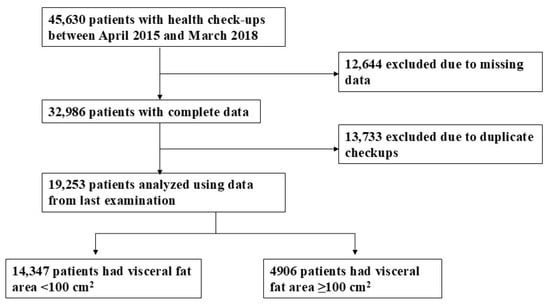 Participants were recruited during a general health check-up program at the Center of Preventive Medicine at NTT Medical Center Tokyo, Tokyo, Japan from 1 April 2015, to 31 March 2018. Participants were mainly in good health and lived around the Tokyo metropolitan area. A total of 45,630 participants were included in the study. Of these, 12,644 were excluded due to missing data, and 13,733 were excluded due to duplicated visits during the study period. To maintain data consistency and avoid overrepresentation, only the last visit for each participant was retained, resulting in a final study population of 19,253 subjects (Figure 1).