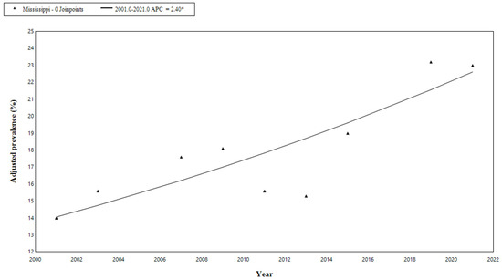 Obesity Trends among Mississippi High-school Students, 2001–2021. * denotes APC being significant.