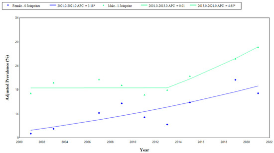 Data from the survey years 2001–2021 were used for obesity trend analysis. First, we applied logistic regression models to detect linear or higher-dimension trends. Time variables were treated as continuous covariates in the models. Log odds ratios of each variable were estimated as a function of time (year), time in quadratic terms, and time in cubic terms, respectively. The highest-order time variable in the model is considered valid. If only a linear year-contrast term is found to be significant, then the associated beta and p-value for that term are used to determine the direction and significance of the trend. If quadratic and/or cubic changes are detected, we generate the sex, race, and grade-adjusted obesity prevalence and standard error for each survey year for the second step of the trend analysis using Joinpoint regression. Joinpoint regression analysis determines the critical values of trend segments. The parametric method was applied to calculate the confidence intervals for the annual percentage change (APC) of the resulting segments and the average annual percentage change (AAPC) of the whole trend from 2001 to 2021 [35,36,37].