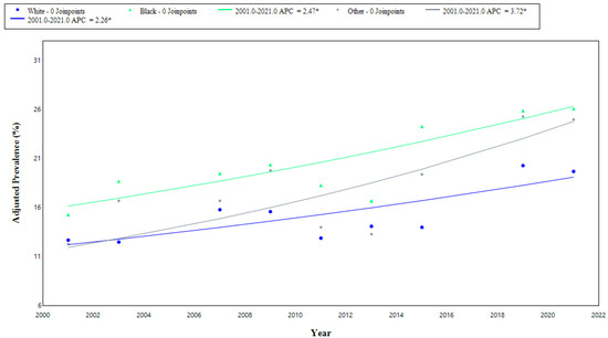 Obesity Trends among Mississippi High-school Students by Race, 2001–2021. * denotes APC being significant.