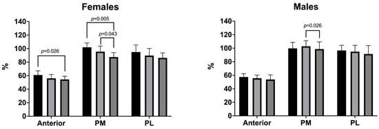 In females, the ANOVA revealed statistically significant differences in dynamic postural balance across nutritional status groups in the PM (p = 0.002) reach direction. Conversely, in the anterior (p = 0.046) and PL direction (p = 0.272), no significant differences were observed between nutritional status groups. The result of the post hoc tests is shown in Figure 1.