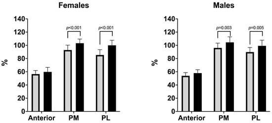 In females, the comparison between physically active and inactive participants revealed significant differences in dynamic postural balance. Specifically, physically active females demonstrated greater reach distances in PM (p = 0.0004) and PL (p = 0.0002) directions (Figure 2). No statistically significant difference was observed in the anterior direction (p = 0.101).