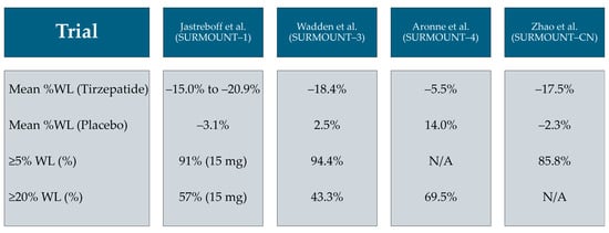 In this review, tirzepatide has been shown to provide significant and sustained weight loss in multiple randomized controlled trials. The SURMOUNT-1 trial, a cornerstone in this evolution, highlighted tirzepatide’s considerable efficacy in non-diabetic individuals with obesity []. In the 72-week, placebo-controlled trial involving non-diabetic individuals with obesity, participants treated with 15 mg of tirzepatide achieved a mean weight reduction of 20.9%, overshadowing the modest 3.1% decline observed in the placebo group []. These outcomes were remarkable in obesity pharmacotherapy compared to traditional drugs []. Nevertheless, the extent of tirzepatide-induced weight loss remains notably lower than that achieved through bariatric surgery, which continues to represent the gold standard in terms of both absolute magnitude and the long-term sustainability of weight reduction [,,,]. This distinction is important, particularly in populations with high-risk obesity or metabolic syndrome where surgical outcomes may confer greater long-term benefit. However, the emergence of tirzepatide among other GLP-1 receptor agonists narrows the gap between pharmacological and surgical interventions, highlighting a notable progress in the medical management of obesity [,,].
