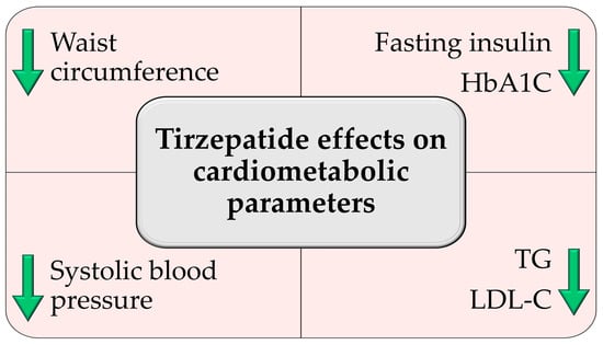 Tirzepatide-induced improvements in cardiometabolic parameters based on the included records. HbA1c: glycated hemoglobin; TG: triglycerides; LDL-C: low-density lipoprotein cholesterol. Green arrows indicate a decrease in the parameter described.