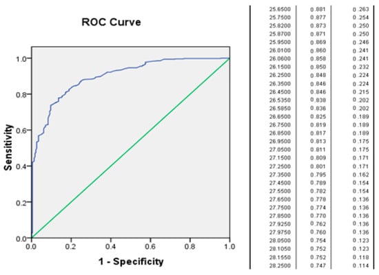 In the analysis according to sex, the following was documented: in females, the maximum performance point in BMI was ≥27, with a Se of 0.829 and 1 − Sp of 0.169 (Sp: 83%). In the male sex, the maximum performance point was 26.6, with a Se of 0.807 and 1 − Sp of 0.209 (Sp: 79%).