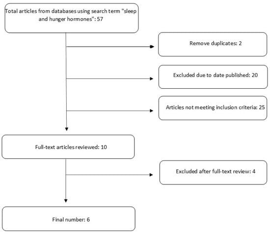 Studies were included if they (1) recruited participants that were 18 years or older; (2) were randomized controlled trials (RCTs) published in peer-reviewed journals with at least 10 participants per experimental group; (3) were published in English; (4) were published within the last 10 years (2013–2023); (5) experimentally manipulated sleep duration in study participants; and (6) measured leptin and ghrelin levels by blood samples. Studies were excluded if they (1) included participants with sleep disorders such as sleep apnea, insomnia, narcolepsy, sleepless leg syndrome, or any others that impact sleep duration; (2) used drugs or medications for sleep deprivation; (3) included participants with acute or chronic medical conditions that could impact sleep duration; (4) were narrative or systematic reviews or animal studies. This review has been submitted to Prospero for registration. Details provided in Figure S1.