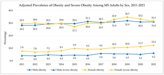 Adjusted prevalence of obesity and severe obesity among MS adults by sex, 2011–2021.