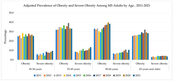 Adjusted prevalence of obesity and severe obesity among MS adults by age, 2011–2021.