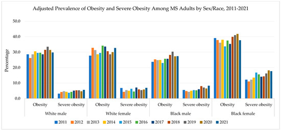 Adjusted prevalence of obesity and severe obesity among MS adults by sex/race, 2011–2021.