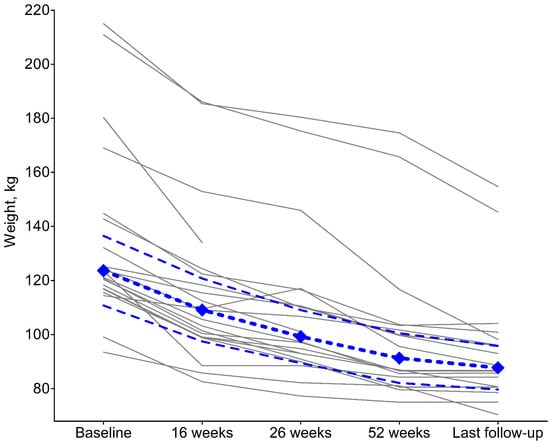 Weight was significantly different at all the consecutive timepoints during the treatment course (p < 0.001). In a pairwise comparison, there was a statistically significant decrease in weight between all sequential timepoints and the baseline (p < 0.001), between 16, 26, and 52 weeks (p < 0.001), and also between baseline weight and weight at the last follow-up (p < 0.001).