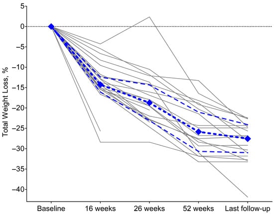 All subjects were identified among patients followed at the Edmonton Adult Bariatric Clinic, a Canadian tertiary care center, between October 2015 and April 2018; their charts were reviewed retro- and prospectively. The inclusion criteria for study participants were age ≥ 18 years, class II or III obesity (body mass index [BMI] ≥ 35.0 kg/m2), monotherapy with liraglutide, and the achievement of ≥20.0% TWL while treated. Exclusion criteria included the use of other AOMs, severe morbidities (infection with human immunodeficiency virus, hepatitis B and C, liver cirrhosis, heart failure), and significant intellectual disability. Out of 1910 patients followed, including 724 (37.9%) treated with liraglutide, 21 patients (2.9% of those treated with liraglutide) met the inclusion and exclusion criteria. Obesity stage was established as per the Edmonton Obesity Staging System (EOSS), which classifies patients into stages of obesity by taking into consideration metabolic consequences, biomechanical complications, and severity of functional and psychosocial impact, providing a more comprehensive understanding of the wide-ranging health effects associated with excess weight [19]. Diagnosis of adiposity-related complications was established according to the most up-to-date guidelines. The last follow-up was defined as the date of the most recent appointment before bariatric surgery or within the study timeframe. One patient was lost to follow-up before the 26-week timepoint as they were not a surgical candidate due to multiple comorbidities. Two more patients were lost to follow-up before 52 weeks, as they lost contact with the healthcare system. All patients were offered an integrated lifestyle modification program, monitored by an obesity medicine specialist certified by the American Board of Obesity Medicine, registered dietitian, psychologist and/or psychiatrist (if indicated), and registered nurse with an overarching goal of reducing calorie intake, self-monitoring food intake, psychological support, and increase in physical activity as tolerated.