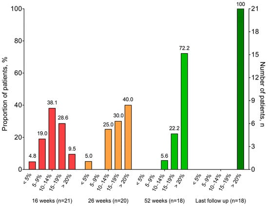 Changes in weight status during liraglutide treatment are presented in Table 2. At liraglutide initiation, median weight was 123.6 kg (IQR 34.9), ranging from 93.5 to 215.0 kg, with median BMI being 45.7 kg/m2 (IQR 7.4). Almost half of the patients (47.6%, n = 10) were at their lifetime peak weight at liraglutide initiation. At 16 weeks post-treatment initiation, weight declined to 109.1 kg (IQR 23.3), reflecting a 14.3% (IQR 3.7) TWL (Figure 1 and Figure 2). Sixteen patients (76.2%) lost ≥ 10% of weight during the first 4 months on liraglutide (Figure 3). At 26 weeks, weight decreased to 99.3 kg (IQR 19.6) and then, by 52 weeks, to 91.3 kg (IQR 18.4) representing 18.7% (IQR 8.8) and 25.9% (IQR 9.6) TWL, respectively. Two patients (9.5%) achieved ≥ 20% weight loss by 16 weeks, eight (40.0%) by 26 weeks, and thirteen (72.2%) by 52 weeks. By the last follow-up, all the patients exceeded 20% TWL. The largest %TWL attained over the course of treatment was 27.5% (IQR 7.4) with a range between 22.4% and 41.9%. To note, the time interval to nadir weight varied substantially, from 44.0 to 89.7 weeks, with a median of 65.1 (IQR 15.5) weeks.