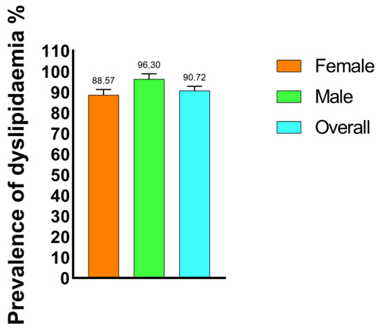 The overall prevalence of dyslipidemia in our study was 90.72%, with males (96%) showing higher rates of dyslipidemia compared to females (89%). Our findings were consistent with previous findings from the Western Cape province, South Africa, where they reported a significant prevalence of 89% dyslipidemia [14]. Similar findings were reported in studies conducted in Bangladesh, where Kamrul-Hasan et al. [15] observed a prevalence of 96.83%, in Jordan with Al Quran et al. [16] and Hyassat et al. [17] reporting 91.4% and 95.4%, respectively, in Bangalore, where Kolhar & P. [18] found 90%.